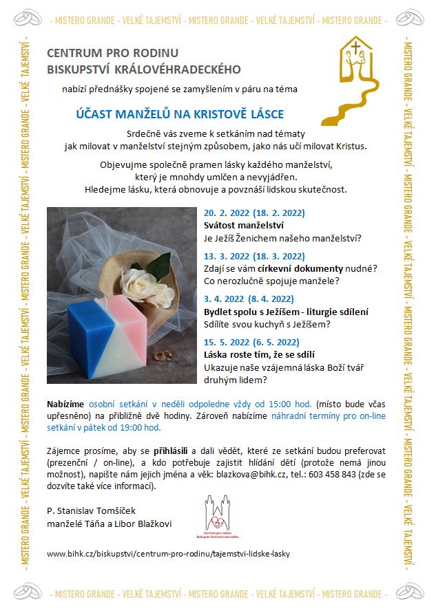 Srdečně vás zveme k setkáním nad tématy jak milovat v manželství stejným způsobem, jako nás učí milovat Kristus. Objevujme společně pramen lásky každého manželství, který je mnohdy umlčen a nevyjádřen. Hledejme lásku, která obnovuje a povznáší lidskou skutečnost.